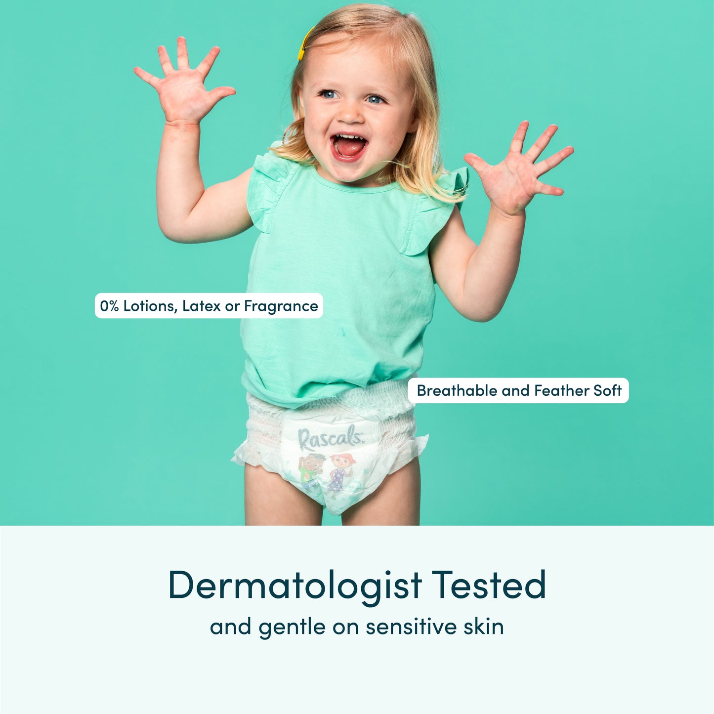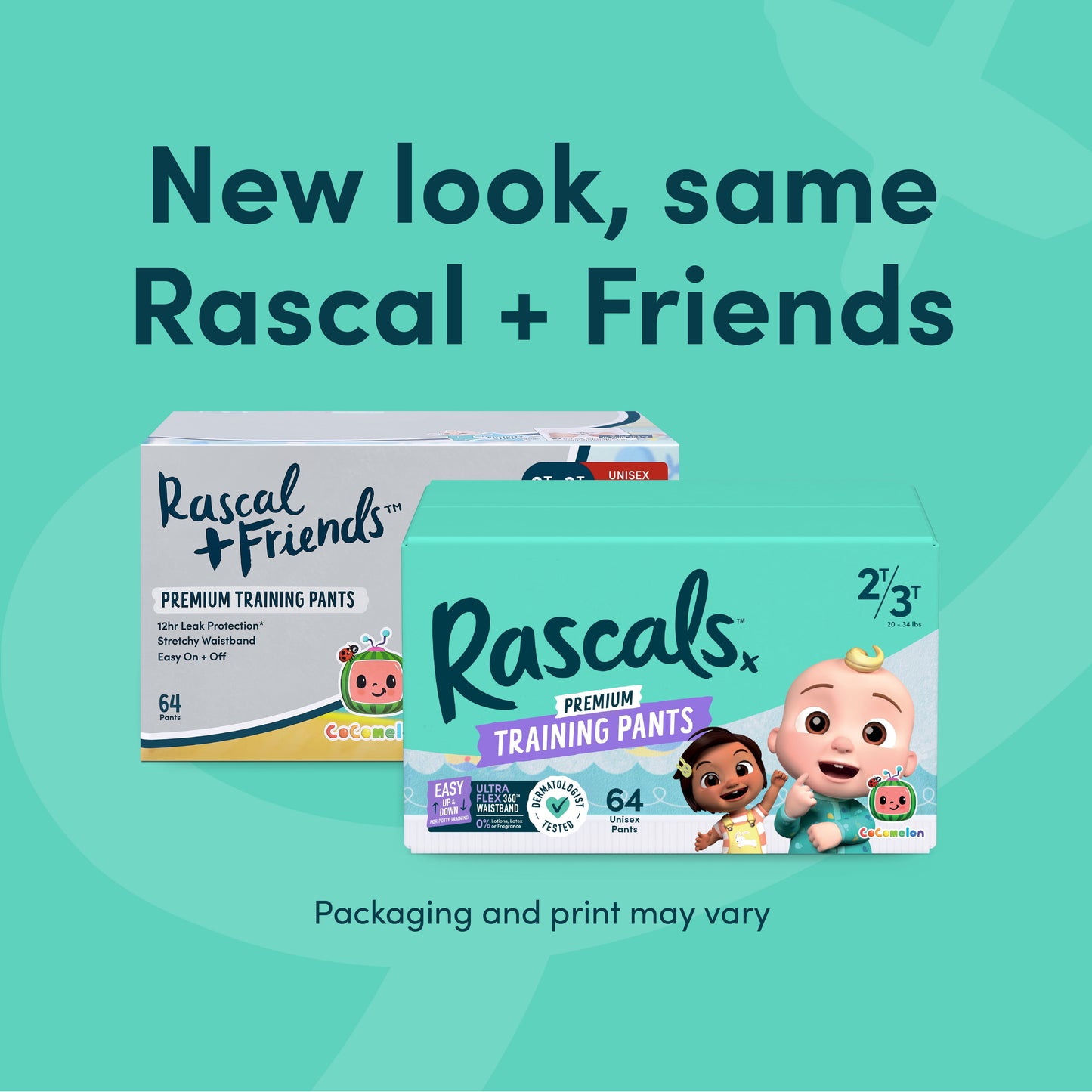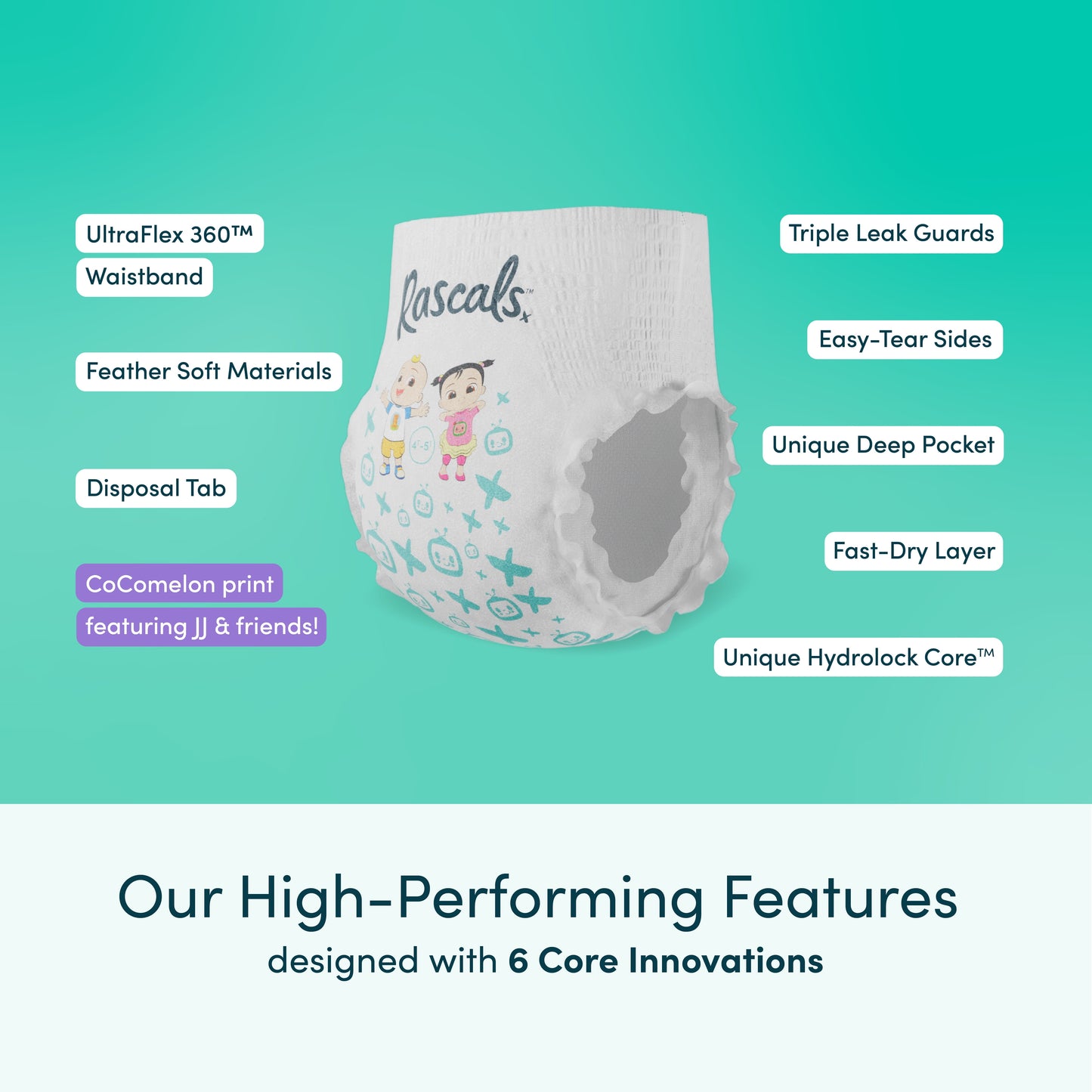 Rascals Premium CoComelon Training Pants help make change-time easier. Designed for active toddlers transitioning from diapers to potty training pants, our training pants offer a comfortable fit with our UltraFlex 360™ Waistband and an Easy Up & Down Design that functions just like potty training underwear. Featuring our fun, unisex CoComelon print with JJ & friends, these toddler pullups are a favorite among toddler boys and girls. Whether you're looking for pullups for potty training or nighttime use, Rascals Premium CoComelon Training Pants are the perfect toddler essential. Available in sizes 2T-3T, 3T-4T, 4T-5T, and 5T-6T, these toddler pull ups cater to every stage of potty training, whether you need daytime training pants or nighttime pull ups. Hypoallergenic and dermatologist-tested safe and gentle on skin, Rascals Premium CoComelon Training Pants are ideal for toddlers on the move; for everyday use, during baby travel and daycare. Don't just take our word for it, Rascals products are loved by millions of parents around the world with over 210,000+ 5-star reviews!* Try Rascals Premium CoComelon Training Pants! Ready for every mess, and designed for potty training support. *Based on all reviews of Rascals diapers, training pants, and wipes across websites globally, including incentivized and organic reviews.