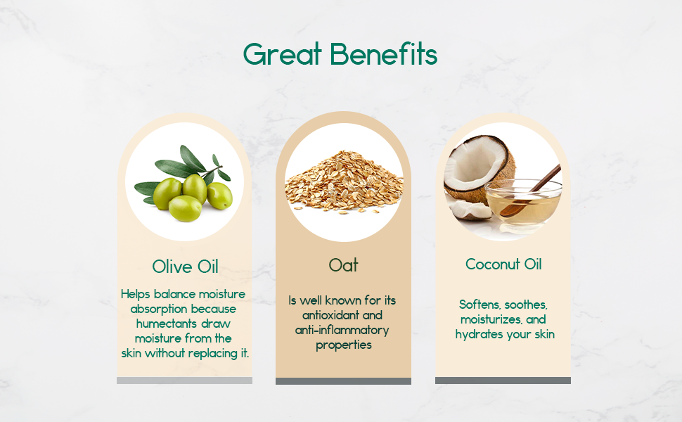 -BENEFITS. Oat is well known for its antioxidant and anti-inflammatory properties. Ingredients like coconut and olive oil soften, moisturize, and hydrate your skin. It helps keep the skin moist but not oily, which helps balance moisture absorption because humectants draw moisture from the skin without replacing it. Honey is well known for its anti-oxidant and anti-inflammatory properties.