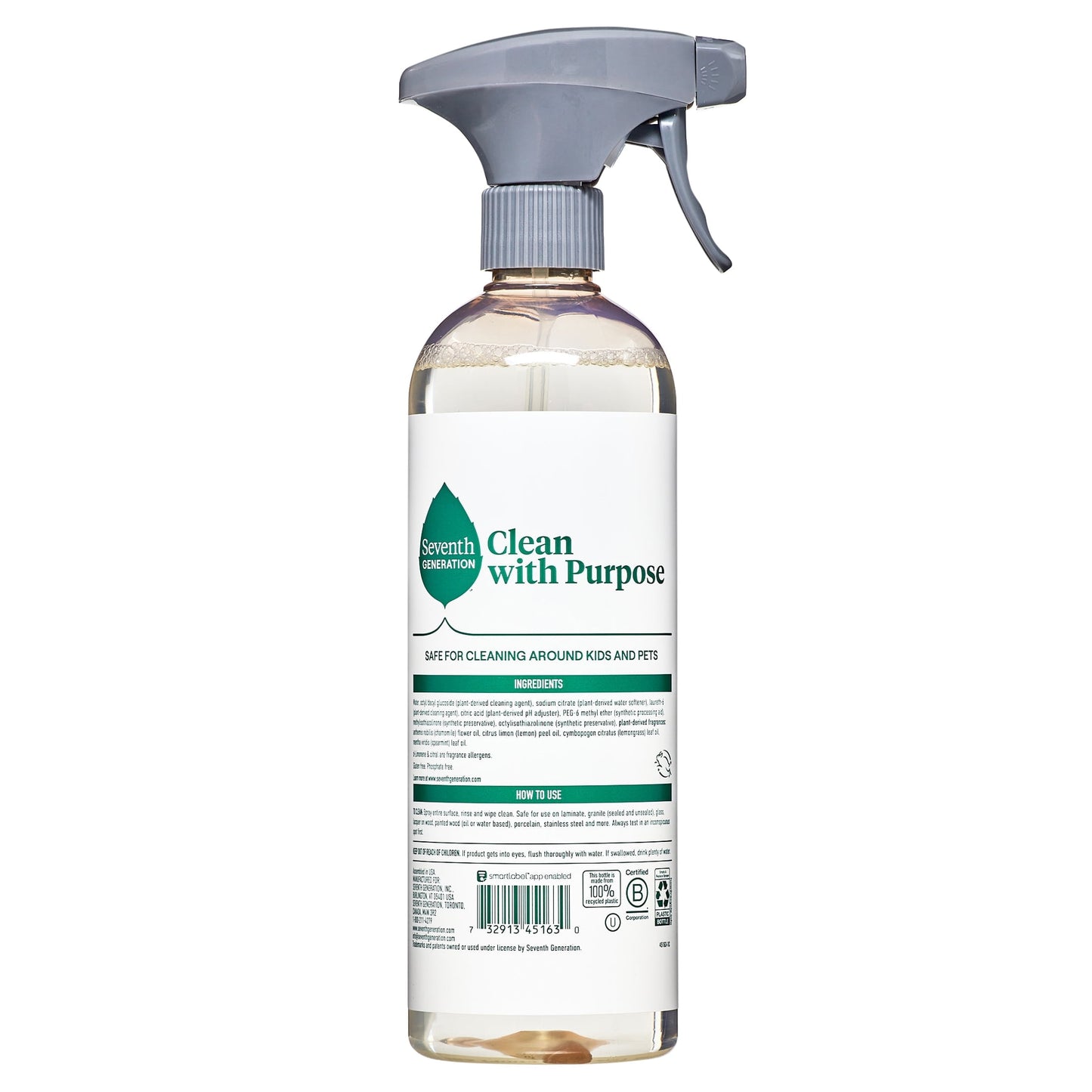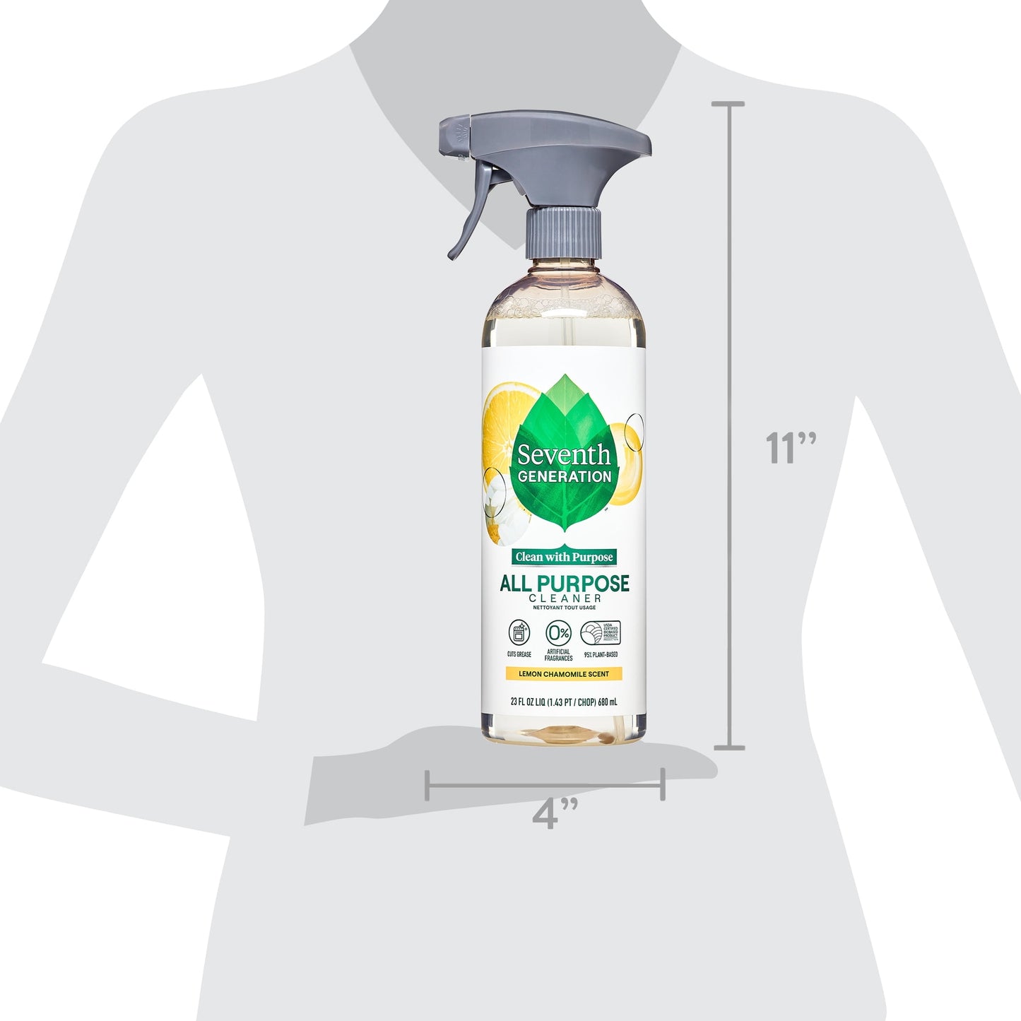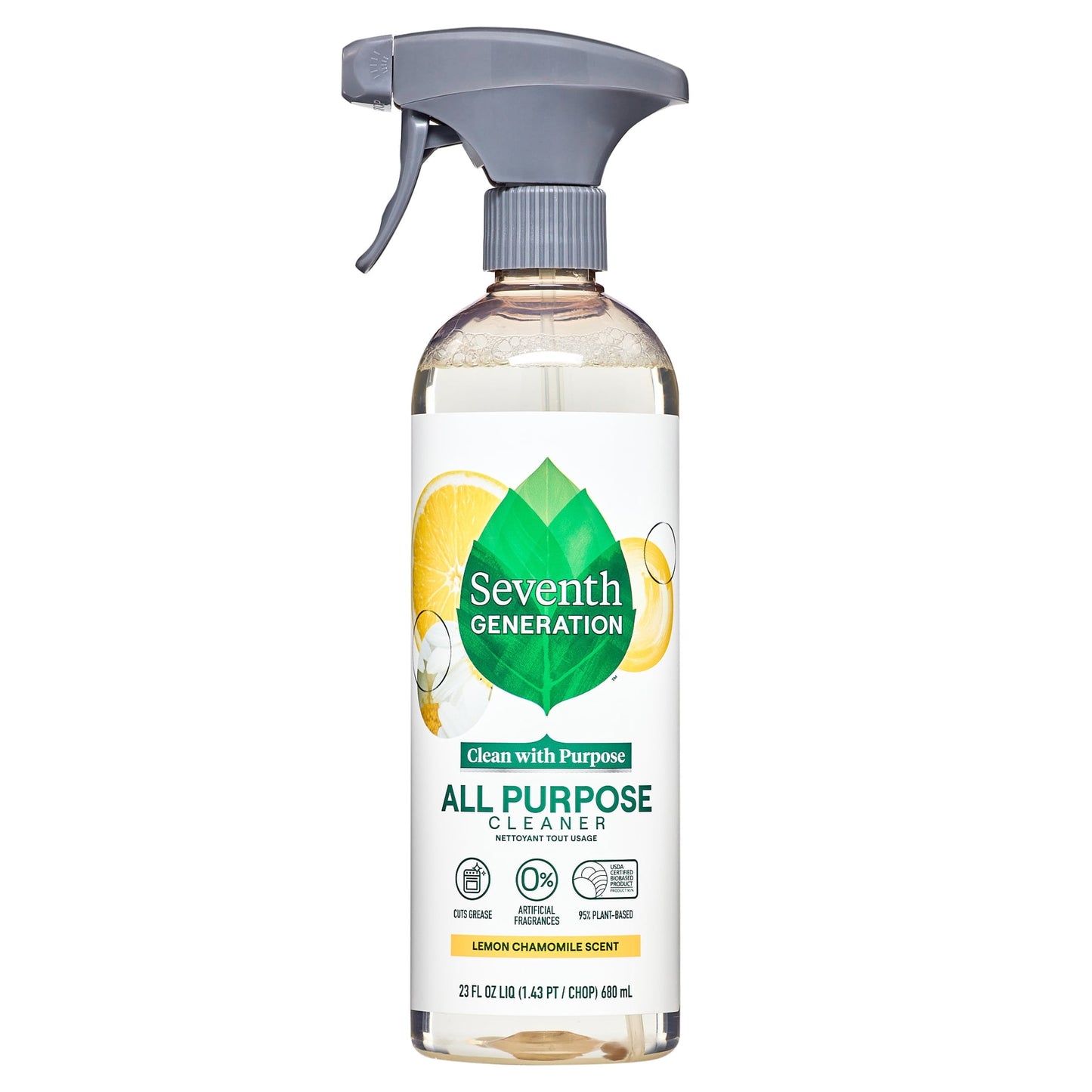 Seventh Generation All Purpose Surface Cleaner, Lemon Chamomile Citrus, 23 oz. Effectively cleans and degreases inside and outside the home. Unlike many conventional cleaning products, our product does not create unpleasant fumes and will not leave harmful residues. This all purpose cleaner is biodegradable formulated and is a USDA Certified Biobased Product 95%. Plus, it is heavy-duty and contains no harsh chemicals, dyes or fragrances. No rinsing is required and a 100% post-consumer recycled bottle.