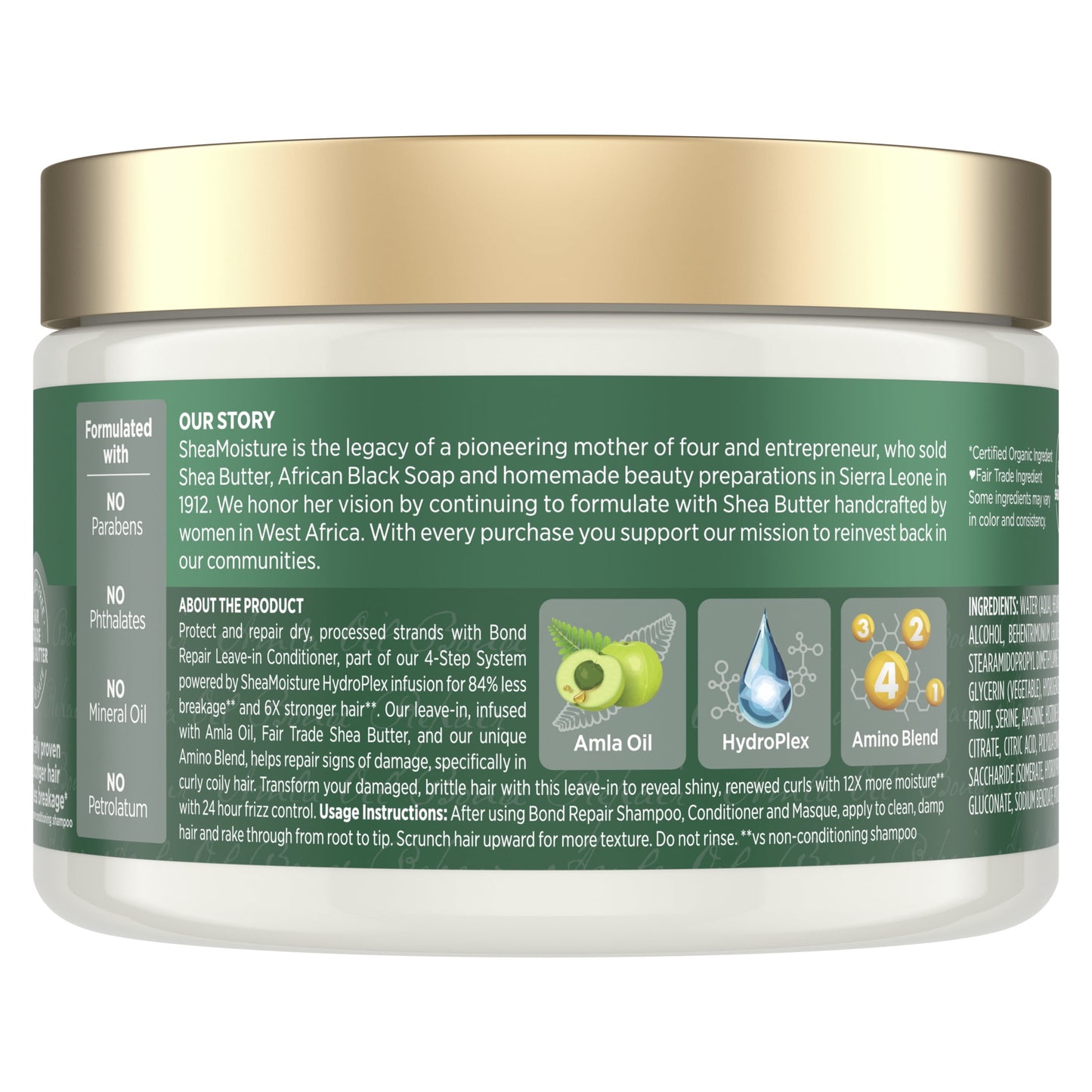 SheaMoisture Strengthening Bond Repair Women's Leave-in Conditioner Amla Oil for Curly Hair, 11 oz. Styling causes damage. We get it. But we also know you love to switch up your hair styles, so we're here to help you do that - without worrying about the damage. The ultimate way to protect hair from styling damage is with SheaMoisture Bond Repair Leave-In. Once you leave it in, you'll never want to leave it behind. How could you when it delivers the ultimate hydration boost, on top of your SheaMoisture Bond Repair Collection routine, that preps and protects your hair to wear any style you like. It's the secret step for worry-free styling that leaves in tons of moisture and leaves out the damage.
