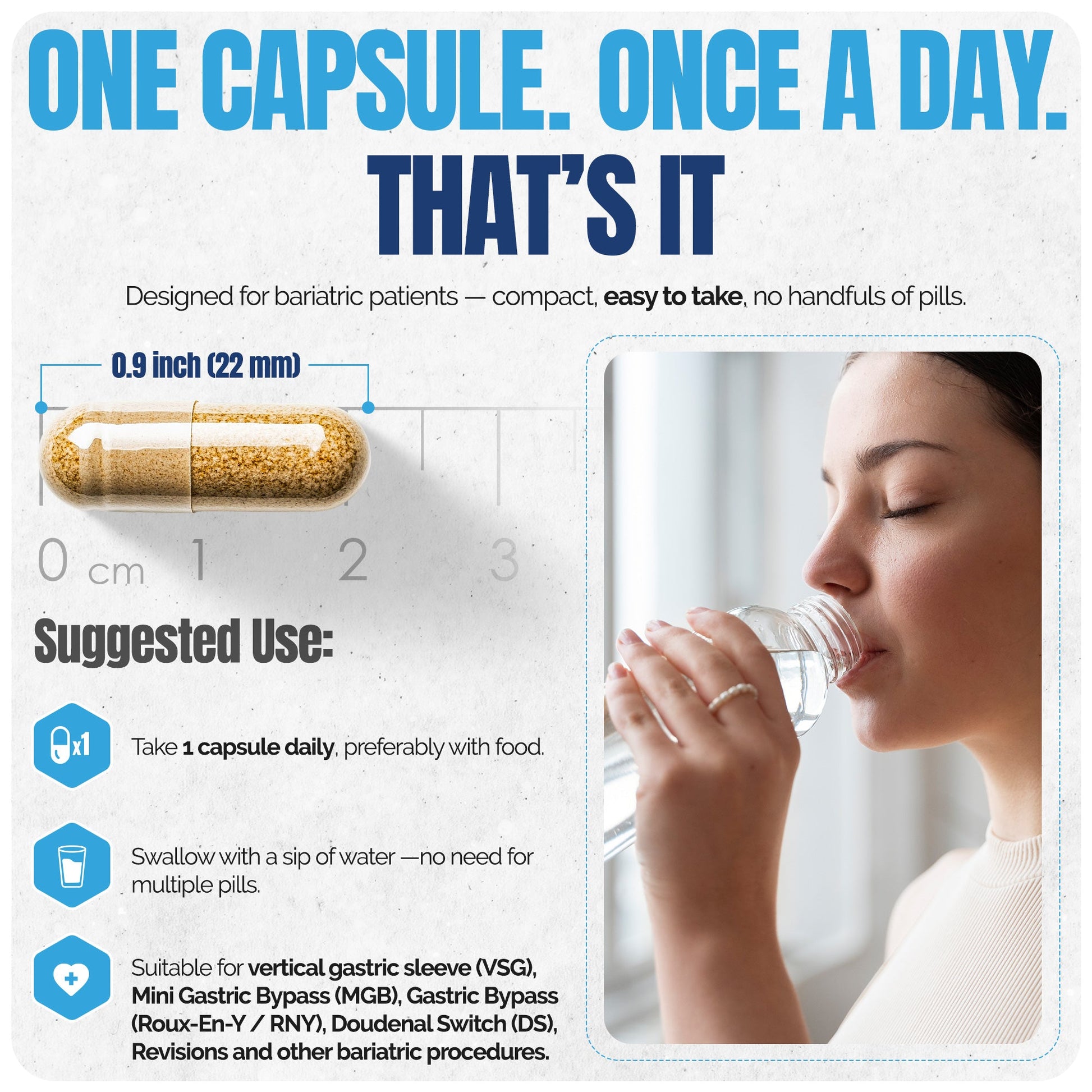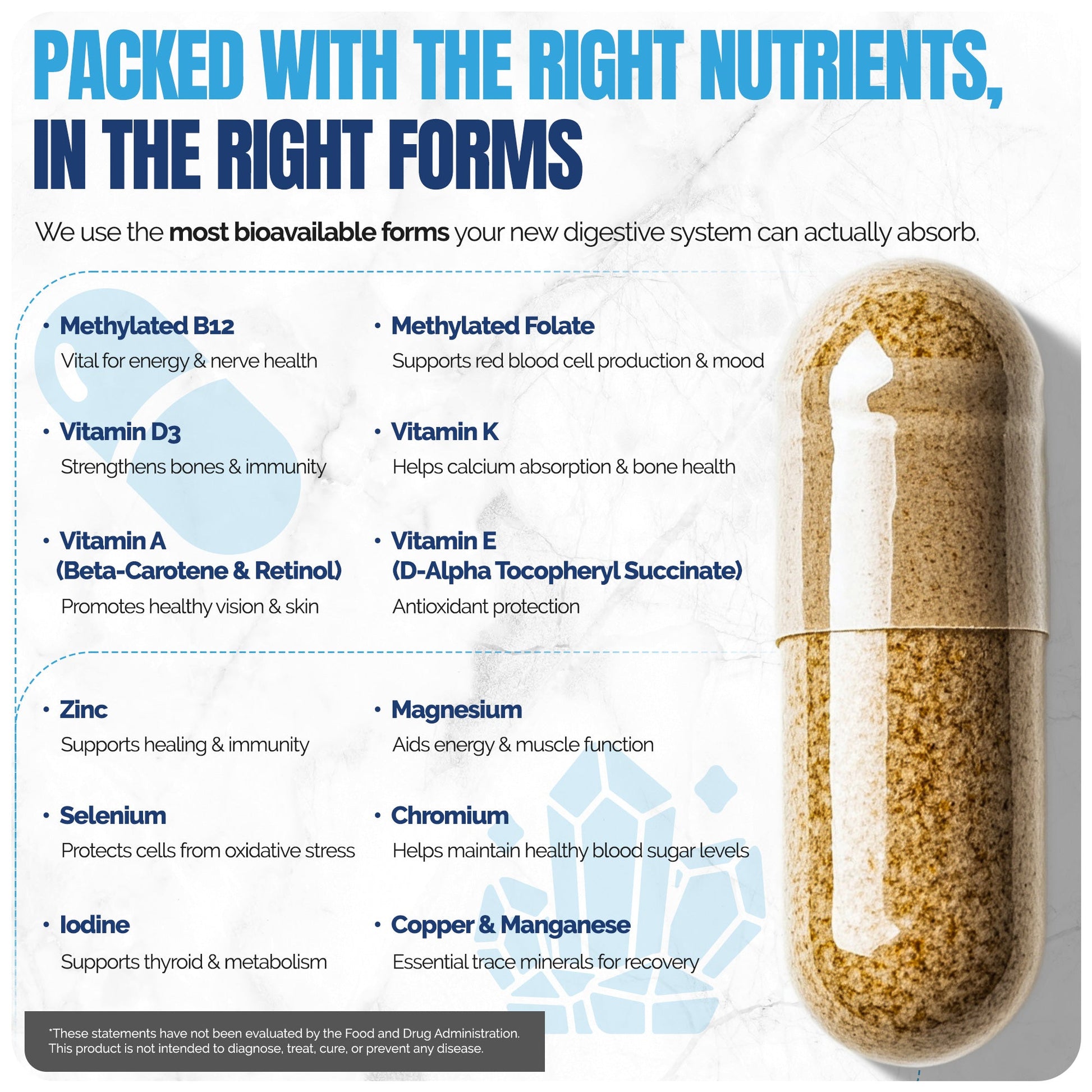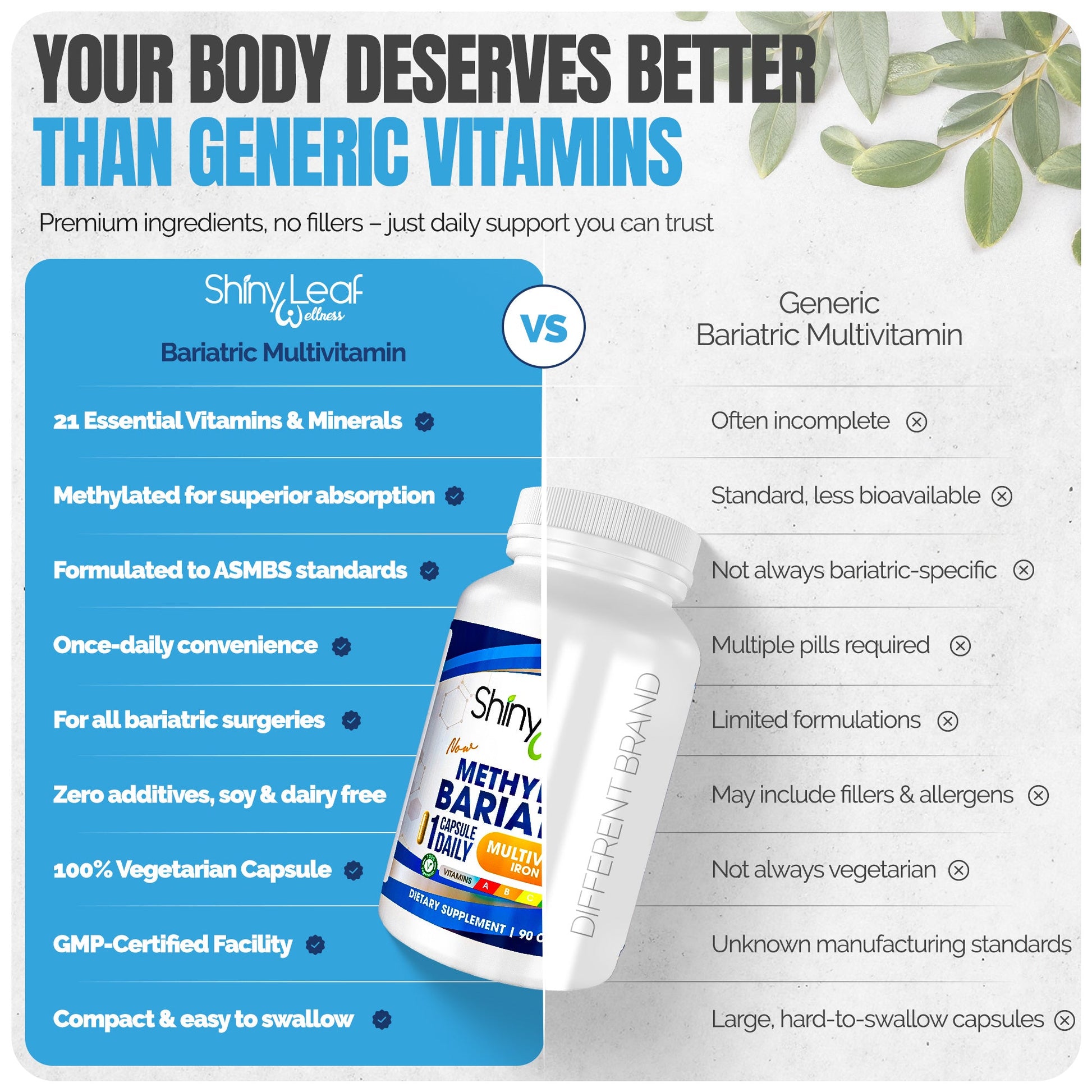 Designed for life after bariatric surgery, Shiny Leaf Methylated Bariatric Multivitamin Without Iron delivers concentrated, highly bioavailable nutrition your smaller stomach can absorb. Each once-daily vegetarian capsule supplies 21 essentials—bioactive vitamin D3, methylated folate (L-5-MTHF), methylated B12 (methylcobalamin), high-potency B-complex, antioxidants A, C, E, zinc, biotin, vitamin K, magnesium, and more—at levels that meet or exceed ASMBS guidelines for gastric bypass, sleeve gastrectomy, Roux-en-Y, duodenal switch, mini gastric bypass, revision surgeries, and other weight loss surgery procedures.