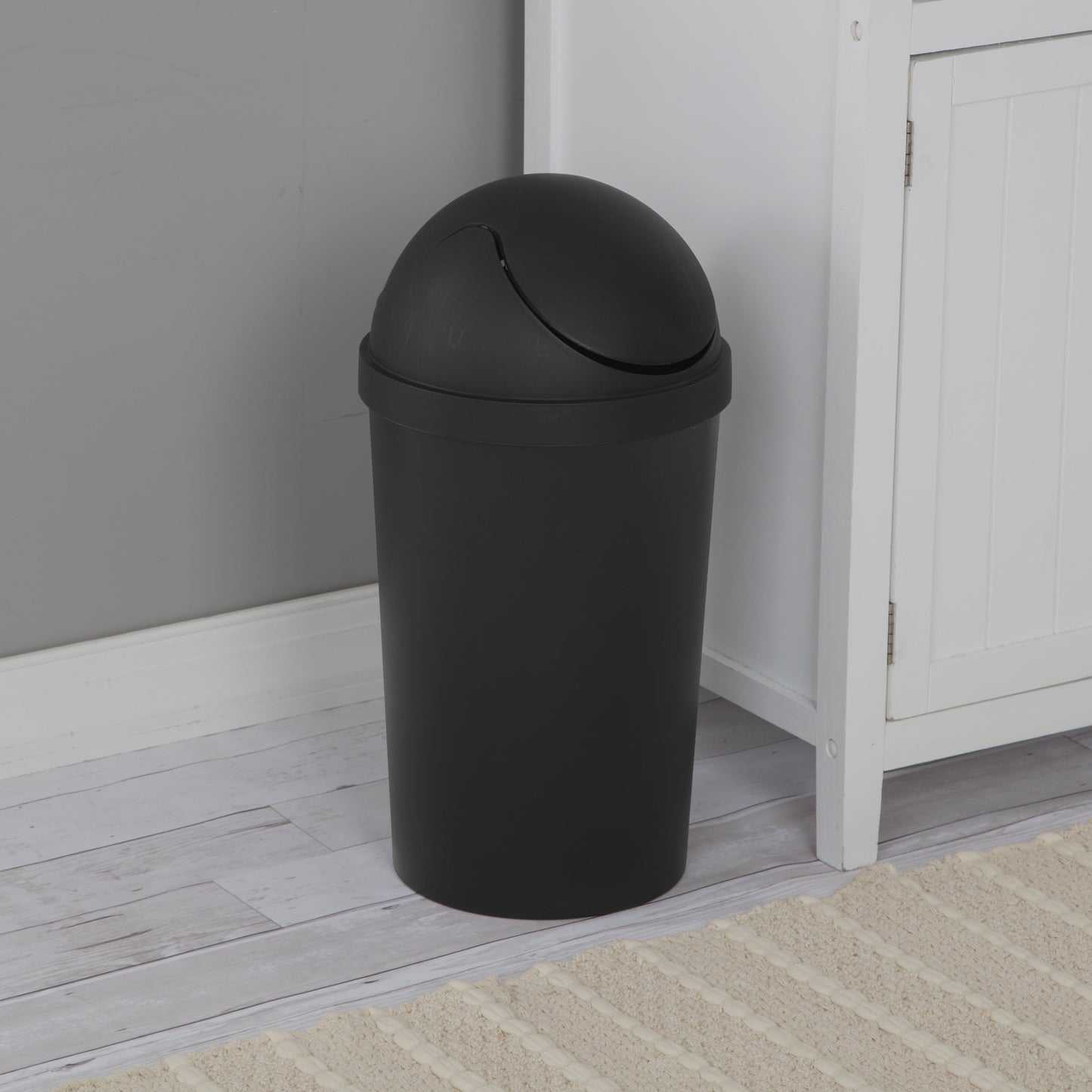 Sterilite 3 Gallon Bathroom Trash Can, Plastic Round Swing Top Wastebasket, Black is ideal for smaller spaces and is great for use in the home or kitchen. It features a round shape and domed-lid design that swings open and closed when pushed, for both large and small items. When the SwingTop wastebasket is closed, items are then concealed making for a more clean and organized look to wherever it is placed in the home. The combination of the polished and textured sides are easy to clean and will add a fashionable element to any home décor. The wastebasket is ideal for use in the bathroom or office and conveniently accommodates a standard plastic shopping bag or 4-gallon trash liner. The overall assembled dimensions of this item are 9 1/2" L x 9 1/2" W x 18 1/2" H.