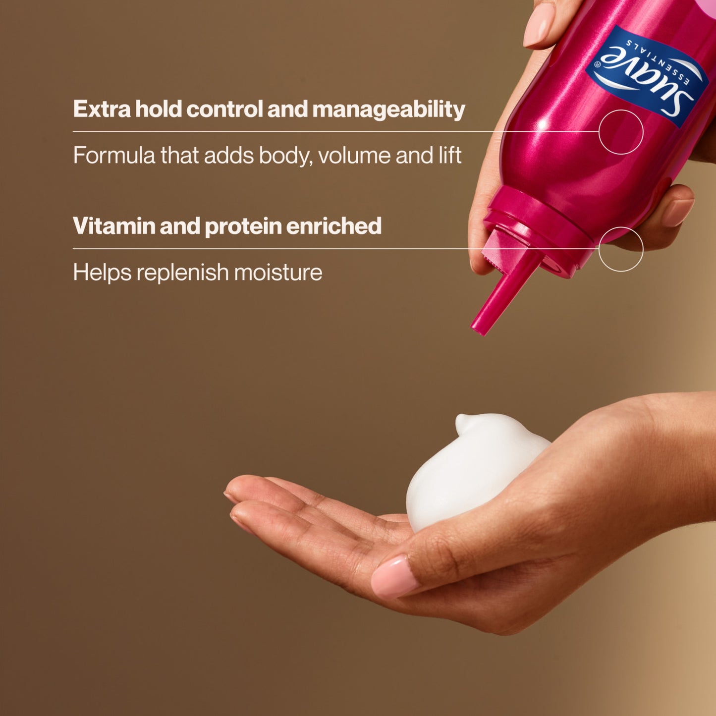 Great style deserves great hold! Get the perfect balance of volume, hold, and frizz control with Suave Extra Hold Hair Mousse. Designed to keep your hairstyle in place all day, this lightweight, lightly scented mousse delivers extra hold without stiffness or stickiness, ensuring your hair stays effortlessly styled without feeling crunchy. Whether you're crafting voluminous curls, sleek updos, or bouncy waves, this styling mousse enhances your look while taming flyaways and resisting humidity. It adds long-lasting volume and body, giving your hair a naturally lifted appearance without weighing it down. Ideal for all hair types, Suave Extra Hold Mousse provides a flexible, touchable finish, making it perfect for everyday styling. Achieve salon-quality results for less than more expensive brands and keep your hair looking flawless from morning to night! Committed to quality, affordability, and accessibility, Suave empowers everyone to look, smell, and feel their best every day. Plus, Suave never tests on animals and all of our products are certified cruelty-free so you can feel good about your choice. For over 75 years, Suave has offered professional quality haircare and skincare products for the entire family. The Suave mission is to make gold standard quality attainable to all, so everyone can look good, smell good, and feel good every day.