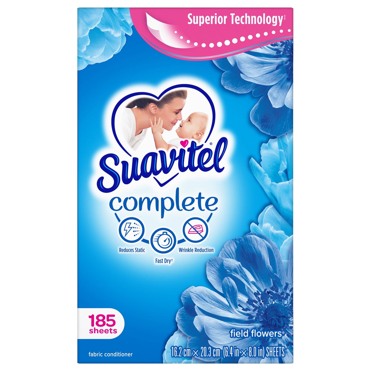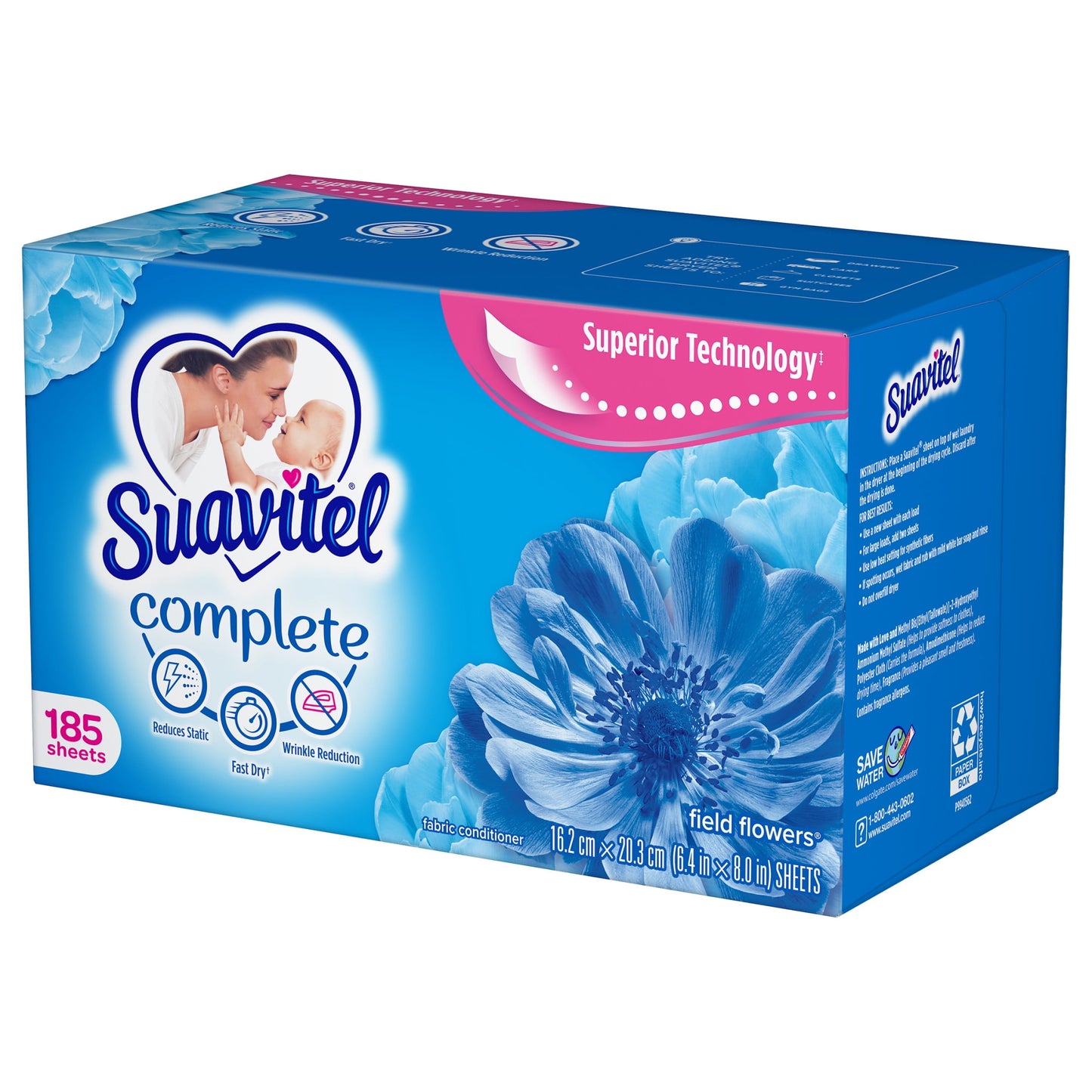 - 185 count box of Suavitel Complete Dryer Sheets, Fabric Conditioner, Field Flowers Scent
