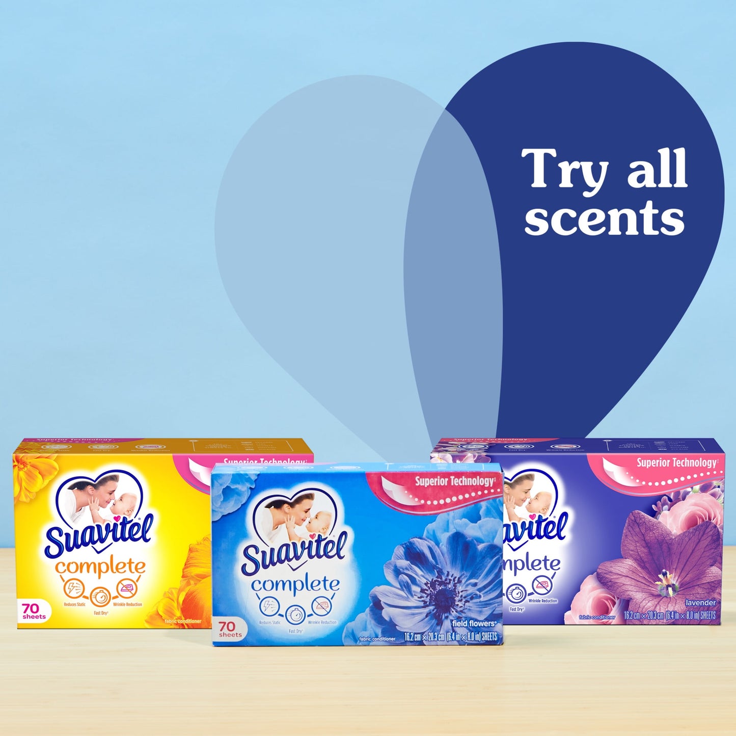 Discover the power of superior technology (1) with Suavitel Complete Field Flowers Fabric Softener Dryer Sheets. Engineered to streamline your laundry experience, these laundry softener sheets offer a remarkable Fast Dry (2) technology, allowing your clothes to dry quicker compared to regular dryer sheets. Effectively reduces static and provides wrinkle reduction, ensuring a smooth finish for your clothes. Enjoy the added bonus of enduring crisp floral freshness and exceptional softness, transforming your everyday laundry into a delightful experience. But why stop at laundry? Extend the fresh, Field Flowers scent to other areas of your life by placing Suavitel dryer sheets in dresser drawers, closets, suitcases, and gym bags. Enjoy the irresistibly fresh scent and the exceptional care that Suavitel brings to your clothes, making freshness easier and more delightful than ever for you and your family. (1) provides Fast Dry benefit vs. Suavitel Regular Dryer Sheets (2) after 5 washes; tested on cotton and cotton-polyester swatches; vs. detergent alone