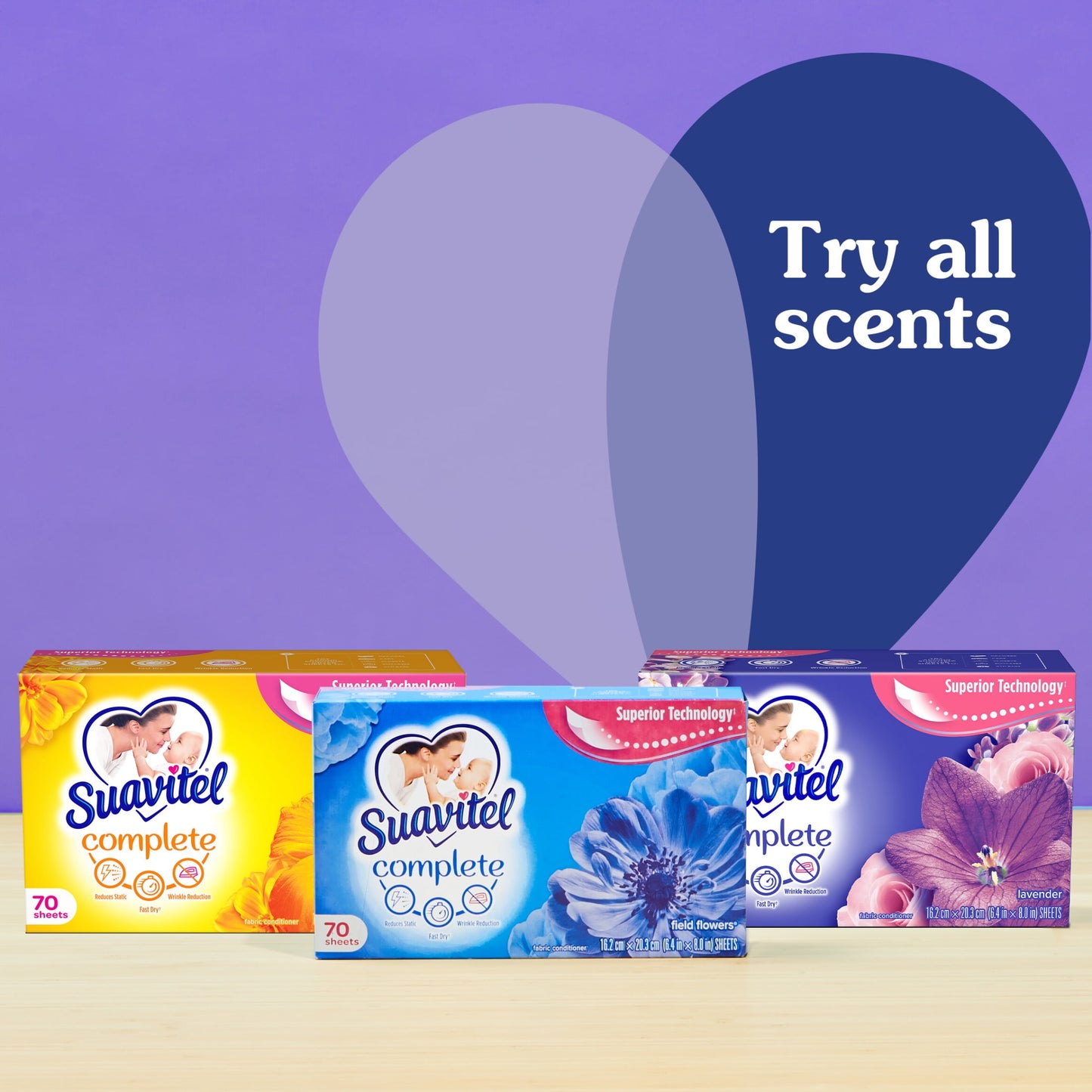 - One 70 count box of Suavitel Complete Dryer Sheets, Fabric Conditioner, Morning Sun Scent