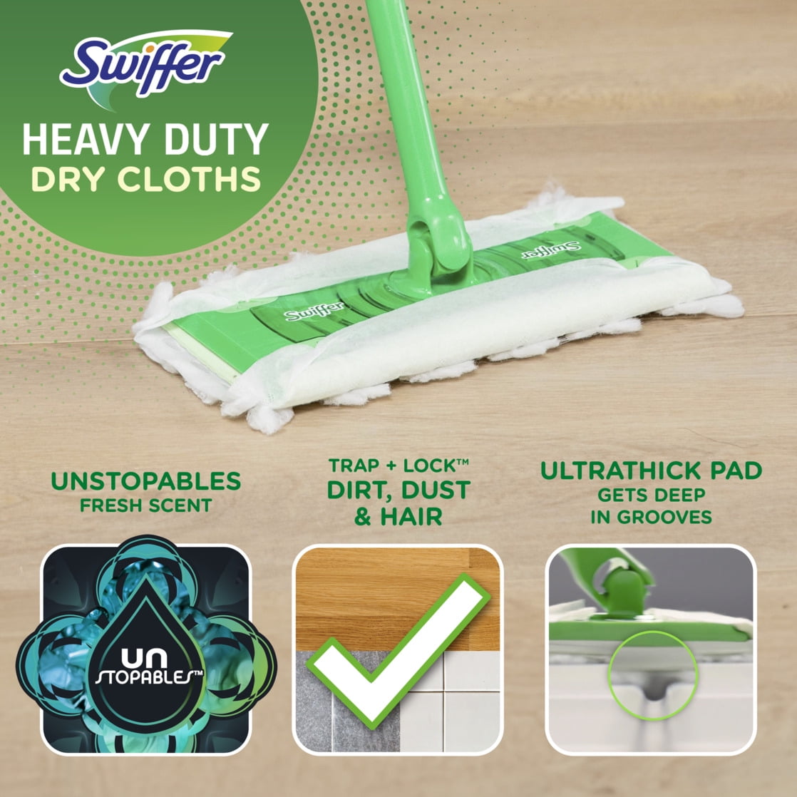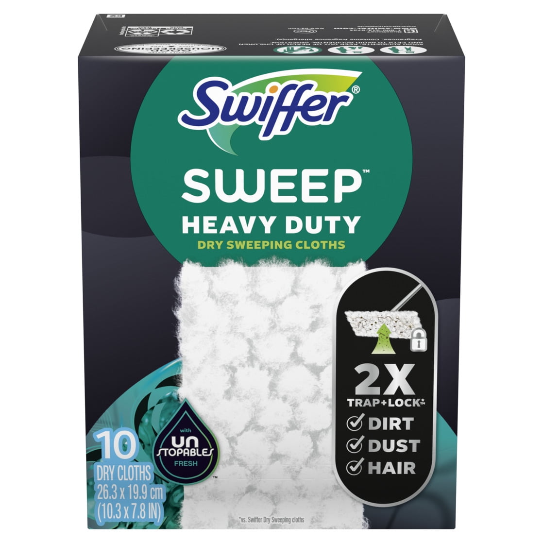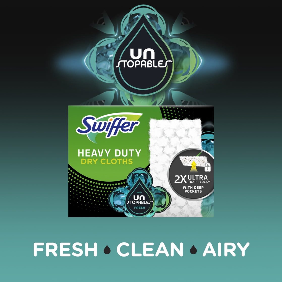 Swiffer Sweeper Heavy Duty Multi-Surface Dry Sweeping Cloths remove up to 95% of allergens* and TRAP + LOCK 2X more dirt, dust, and hair**, allowing you to clean all your hard floor surfaces quickly and easily. Use with your Swiffer Sweeper Dust Mop - the convenient combination of a broom and mop for a quick and easy clean. Experience Lasting Freshness*** with Swiffer Heavy Duty Dry Sweeping Cloths, now in the Fresh, Clean, and Airy Unstopables Scent you love!*Leaves behind up to 1 hour of freshness after initial product use*Common inanimate allergens from cat and dog dander & dust mite matter**vs. Multi-Surface Swiffer Sweeper Dry Cloth ***Leaves behind up to 1 hour of freshness after initial product use