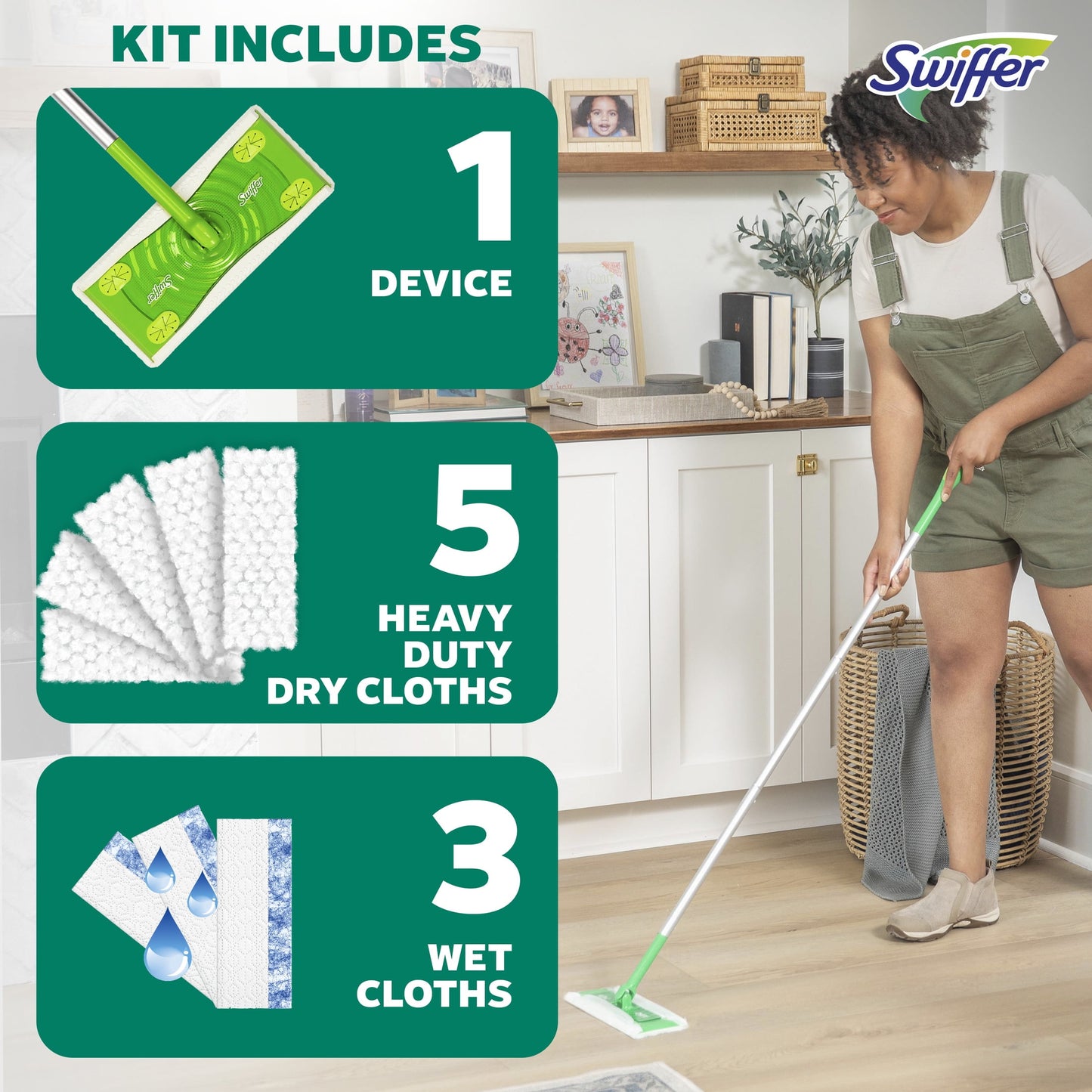 Swiffer Sweep and Mop is a 2-in-1 multi-surface hard surface floor cleaner designed for both sweeping and mopping—no dustpan or bucket required! First, use a Dry Sweeping Cloth. With deep ridges and grooves that conform to the surface of your floor, it TRAPS AND LOCKS dirt, dust, and hair, making it an ideal floor cleaner. Next, use a Wet Mopping Pad to dissolve dirt and grime and trap it away, giving you an amazing clean. Enjoy the convenient combination of a broom and mop for a quick and easy floor cleaner that gets dirt out of your home once and for all. With Swiffer Sweep and Mop floor cleaner, you can easily transition from sweeping to mopping, making your cleaning routine even more efficient. 1 Starter Kit, Includes 5 Heavy Duty Dry Sweeping Cloths and 3 Heavy Duty Wet Sweeping Cloths