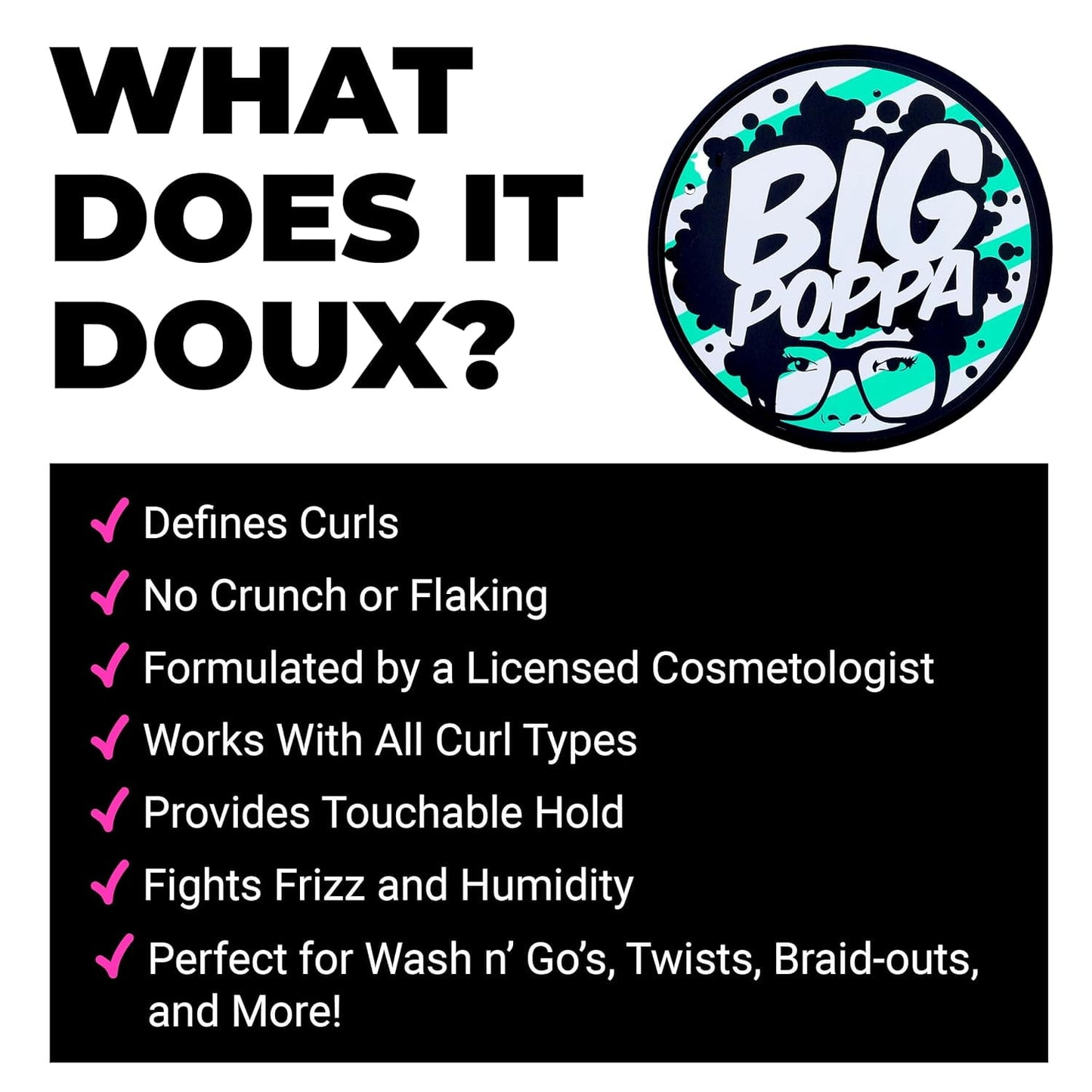 The Doux BIG POPPA is all you need for notorious definition and poppin’ curls that don’t stop. Humidity-resistant and frizz-fighting formula shines & defines all curl types with a flexible hold. Perfect for touchable, soft wash & go’s, higher density coils, sticky buns and laying down edges. BIG POPPA offers just the right amount of flex for easy wash days, the rich Babassu-oil infusion means it won’t leave your curls, coils or hands dry. A clean, light fragrance makes it perfect for the whole fam. That’s if you can resist keeping it all to yourself. Usage: Apply to freshly washed, clean, wet, product-free hair in small sections from roots to ends. Use alone or top it off with a small amount of MOUSSE DEF Texture Foam for added humidity resistance. Air dry or diffuse, avoid touching it until 100% dry. We mean it. Don’t touch. Once dry, fluff & style away.
