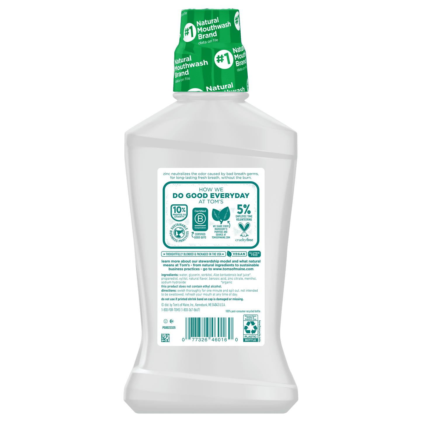 Long-lasting fresh breath? Yes, please! Painful burning sensation? No thanks! Tom's of Maine Wicked Fresh! Natural Mouthwash brings out your best breath without the burn. This fluoride-free, alcohol-free* mouthwash uses zinc to neutralize the odor caused by bad breath germs. Plus, it contains no artificial flavors, colors or preservatives and is not tested on animals. Swish the Cool Mountain Mint flavor before your next presentation or hot date for a little boost of confidence. To use, vigorously swish between your teeth for one minute, then spit out. At Tom's of Maine, we want to empower families to live more naturally. With more than 50 years experience combining scientific know-how, naturally derived ingredients and a bit of ingenuity, we make products that are good for you and the planet. As a Certified B Corp, we hold ourselves to the highest social and environmental standards. Plus, we're committed to supporting local communities for meaningful change, donating 10% of our profits to charities supporting health, education and the environment. We call this "doing good, for real," and it impacts everything we do. *Product does not contain ethyl alcohol