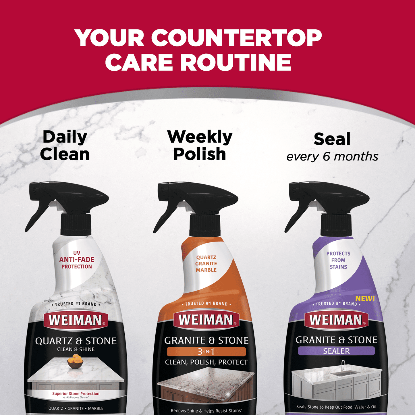 Enhance the natural beauty of stone surfaces in your home with the Weiman Quartz Clean & Shine Trigger Spray. Here at Weiman, we have developed cleaning products that go beyond simply cleaning to beautify and protect each of your delicate difficult to care for surfaces. Instantly reverse dullness & enhance the brilliance of your stone surfaces with Weiman Quartz Clean & Shine Cleaner Spray. Its superior cleaning power brings out a whole new level of luster and helps resist stains. A natural cleaner engineered with a pH neutral specialized formula that instantly shines dull, faded counter tops & removes water marks without leaving behind streaks or damaging the surface. This thick, rich cleaner seals, reveals and protects granite, marble, soapstone, quartz, quartzite, slate, limestone, corian, travertine, laminate, tile & concrete. The Weiman Quartz Clean and Shine Spray is designed with a non-toxic, non-acidic formula that will effortlessly clean without leaving any streaks on your sink, table or countertops. Effortlessly lift dirt, soil, grease and grime to enhance your brand new surfaces or bring life back to your old stone surfaces. Reveal the original brilliance of your natural stone surfaces & make the Weiman Quartz Clean and Shine Spray an essential for everyday treatment. Weiman wants each of the surfaces in your home to look its best. That’s why we have developed cleaning products that go beyond simply cleaning to beautify and protect each of your delicate, difficult to care for surfaces. From stainless steel to leather to granite, each of our products is formulated specifically for one surface and one surface only; allowing you to achieve the perfect results that your home deserves. A clean home is great, but we want it to look more than clean, we want it to look spectacular! Weiman leaves a polishing shine and acts as a protector where other cleaners do not compare.