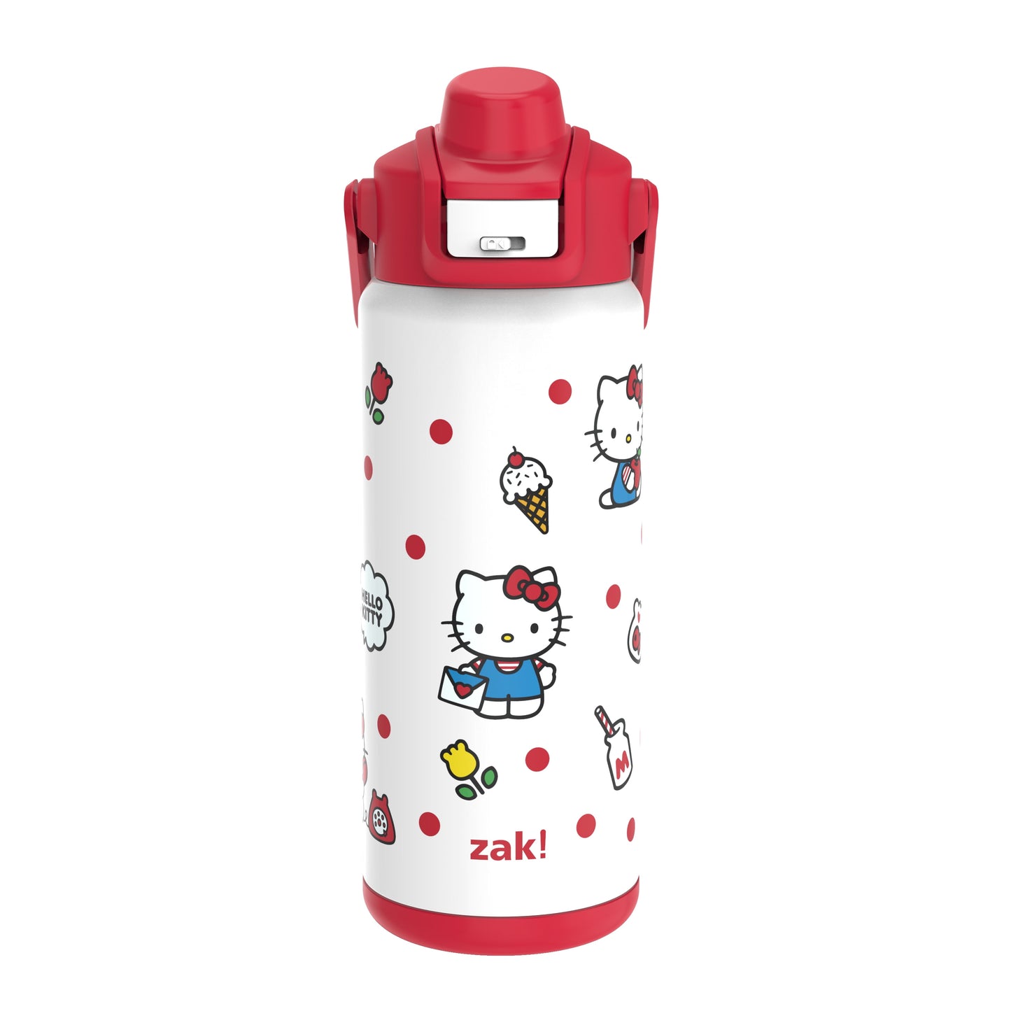 The Zak Designs water bottle holds 20 ounces and is made of food-grade stainless steel, durable enough for kids to take anywhere they want. It's vacuum insulated, so cold drinks will stay that way for longer, and you'll avoid leaving messy water rings since condensation won't form on the outside. The comfortable silicone spout can be covered to keep it clean when it's not being used. It opens easily (even for kids!) at the push of a button and has a sliding lock to keep it shut. The lid screws on securely, won't leak when the spout is fully closed, and has a carry handle for traveling convenience, making this bottle perfect for everyday adventures. It even comes with a silicone bumper to protect from dents and scratches! Don't put it in the microwave—it's made for cold drinks—and the bottle should be washed by hand to preserve the vacuum seal and keep the artwork bold and bright.